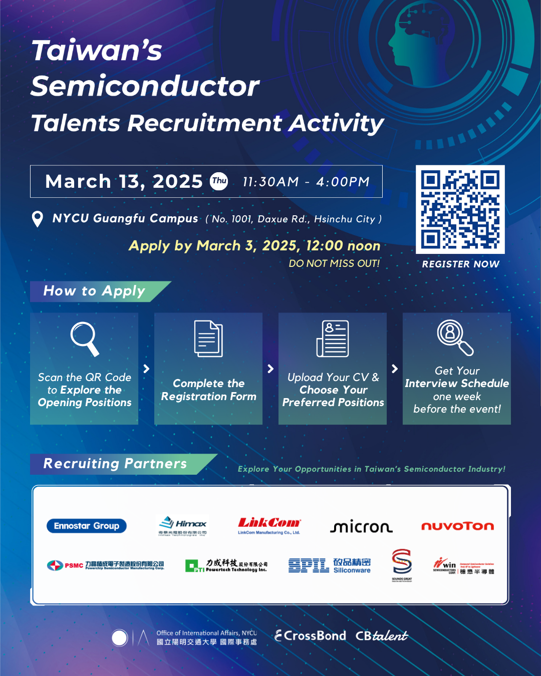 國立陽明交通大學敬邀各校僑生及外籍生參加春季國際生半導體攬才活動, 本活動提供留臺就業、面試機會予未來完成學業後有意留臺發展之僑外生,歡迎各校僑外生踴躍參加活動。