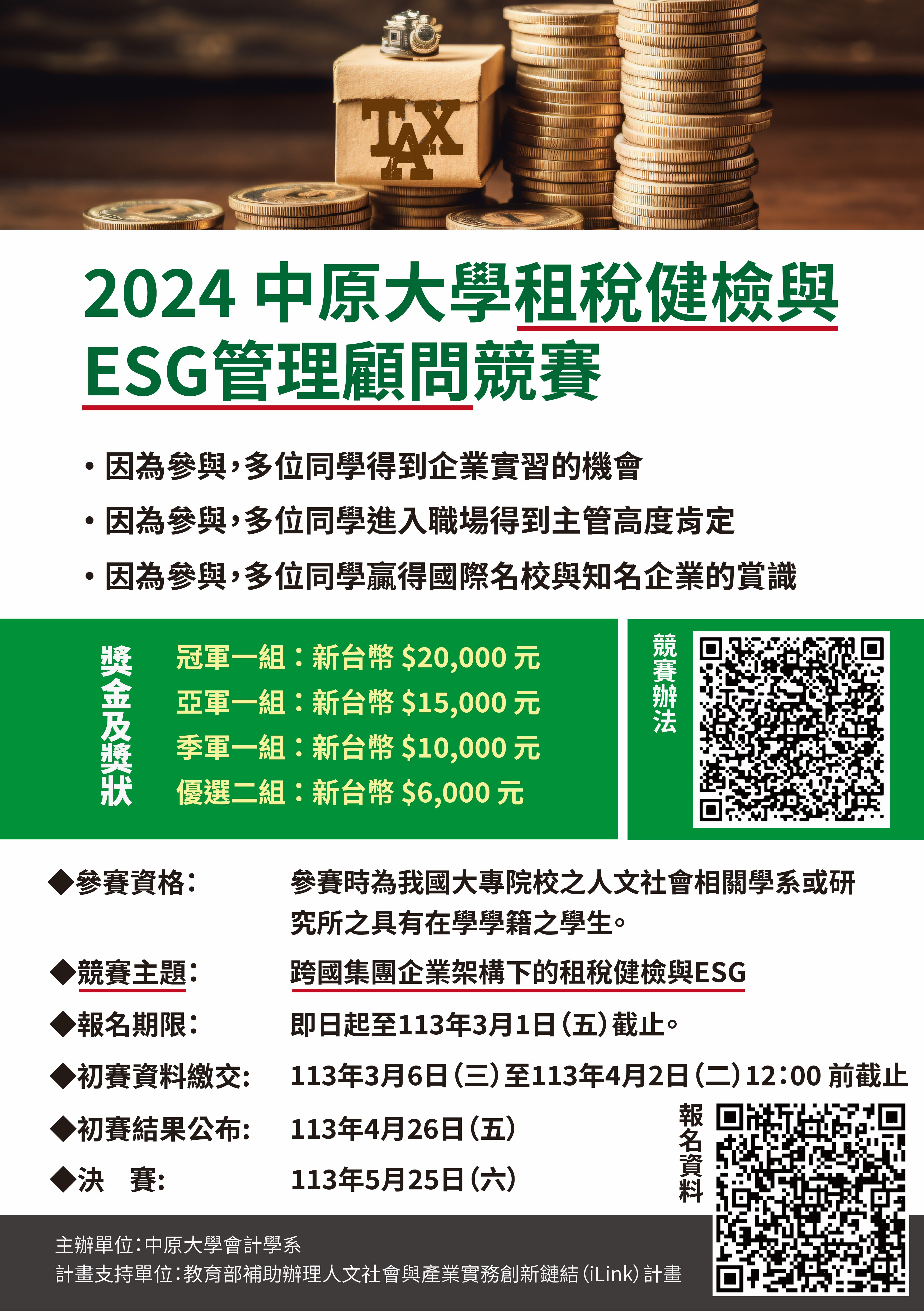 一、為使學習稅法的學生們,能將稅法知識轉化為實務上的應用與分析能力,具備敘事力、解決專業問題、邏輯分析與思考批判的能力;並能面對多變的社會,具有持續學習、自我進修的能力,特舉辦此活動,希望藉由參與競賽獲得寶貴的經驗,提升對稅務專業領域的應用與學習的興趣。