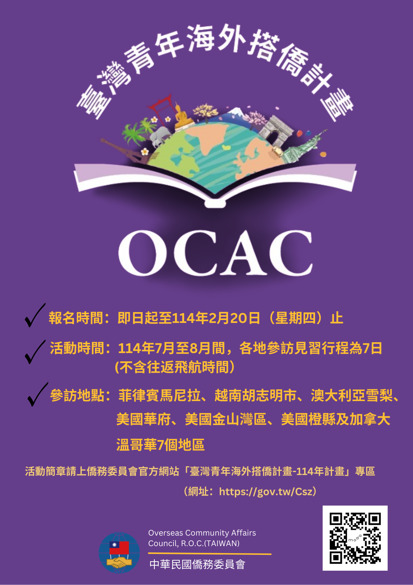 主旨 : 為增進臺灣青年認識政府僑務工作,拓展國際視野,並搭建與僑界之橋梁,本會自106年起推動「臺灣青年海外搭僑 計畫」,選送臺灣青年赴海外各地參訪見習。