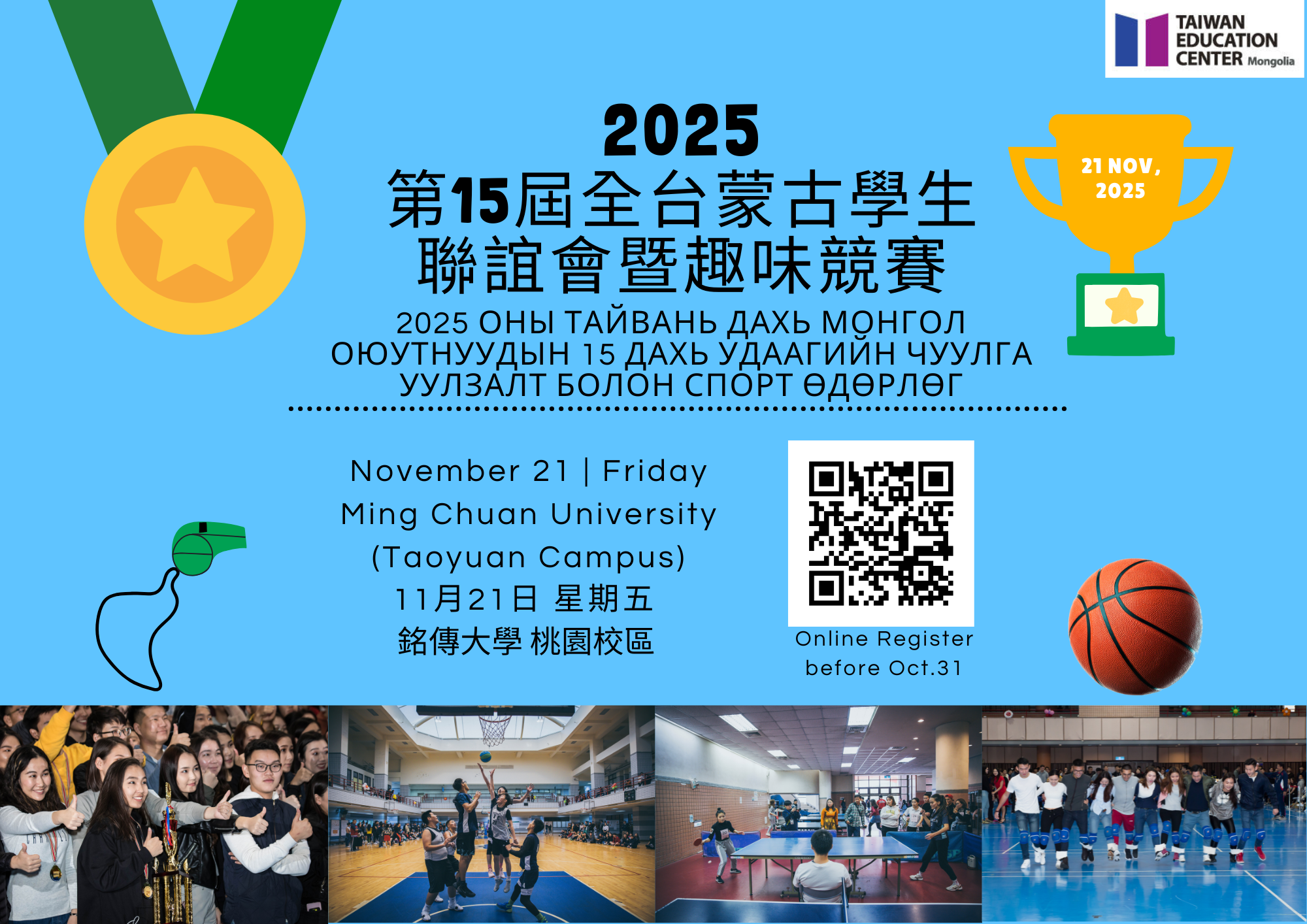 一、蒙古臺灣教育中心擬於 11 月 21 日(星期五)假銘傳大學桃園龜山校區舉辦「2025全台蒙古學生聯誼會暨趣味競賽」,以增進在臺就讀之蒙籍學生情誼與向心力。