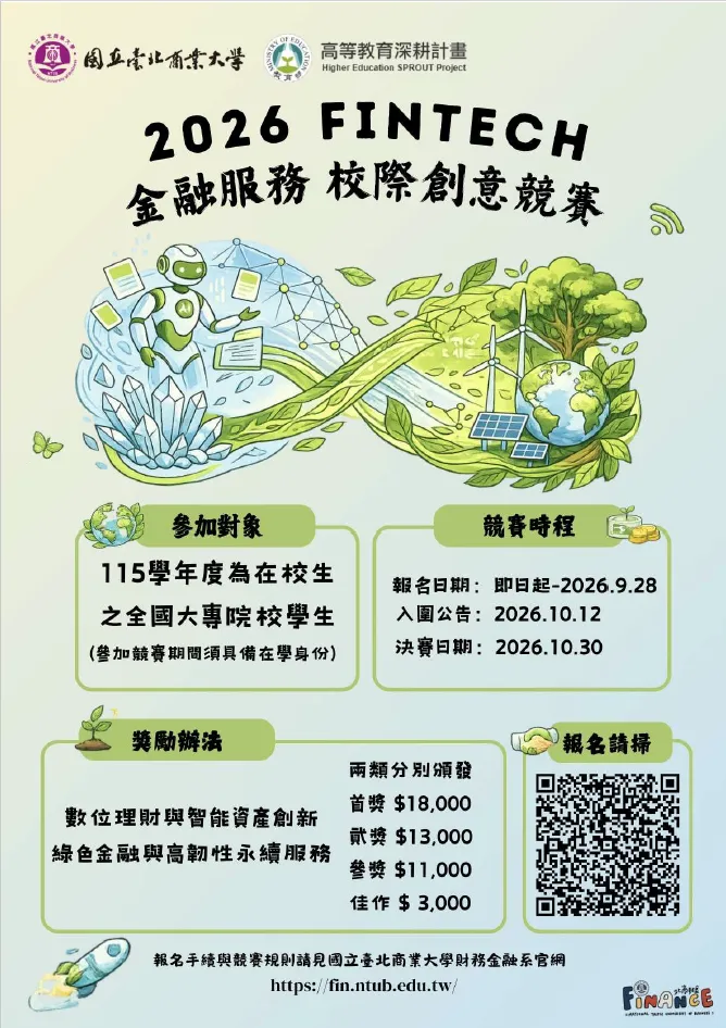 三、詳細競賽資訊及報名等相關辦法請參閱附件,並請至本校財務金融系網站(https://fin.ntub.edu.tw/)查詢。