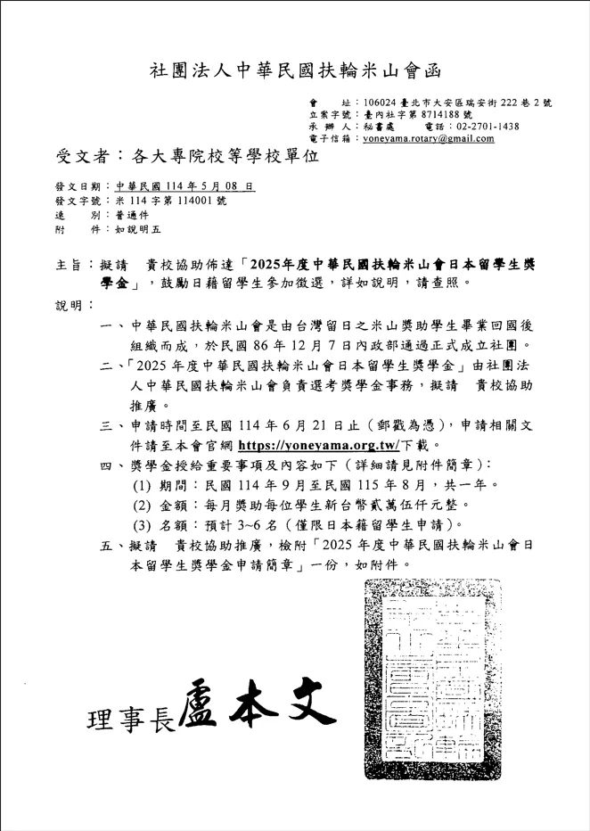 申請時間 : 114年6月21日截止報名網址 : 請詳見下方附件獎學金資訊 : 1.獎助時間 : 114年9月至115年8月 2.獎助金額 : 每名每月新臺幣25,000元 3.名額 : 預計3~6位(僅限日本籍留學生申請)檔案下載公告.webpWEBP公告.webpWEBP