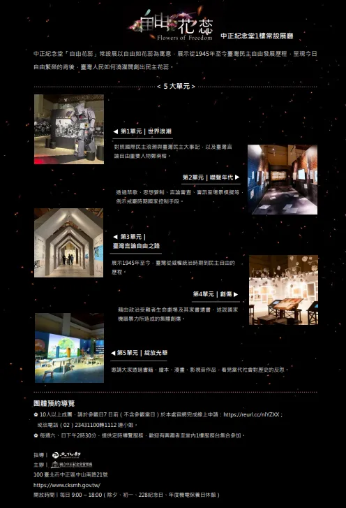 一、該處「自由花蕊」常設展於114年11月24日開展,展覽包括5大單元,除強化影音、互動、物件展示,形塑沉浸式觀展環境,亦提供免費導覽服務,歡迎多加利用。